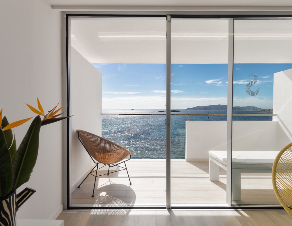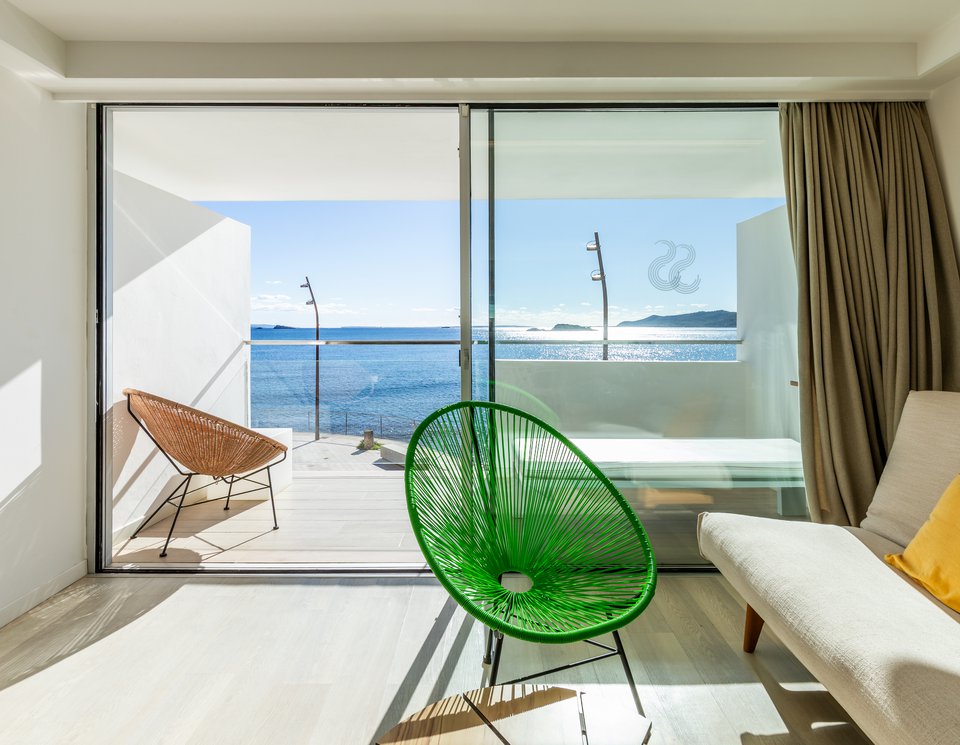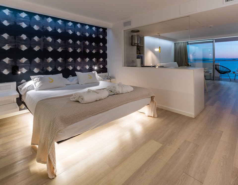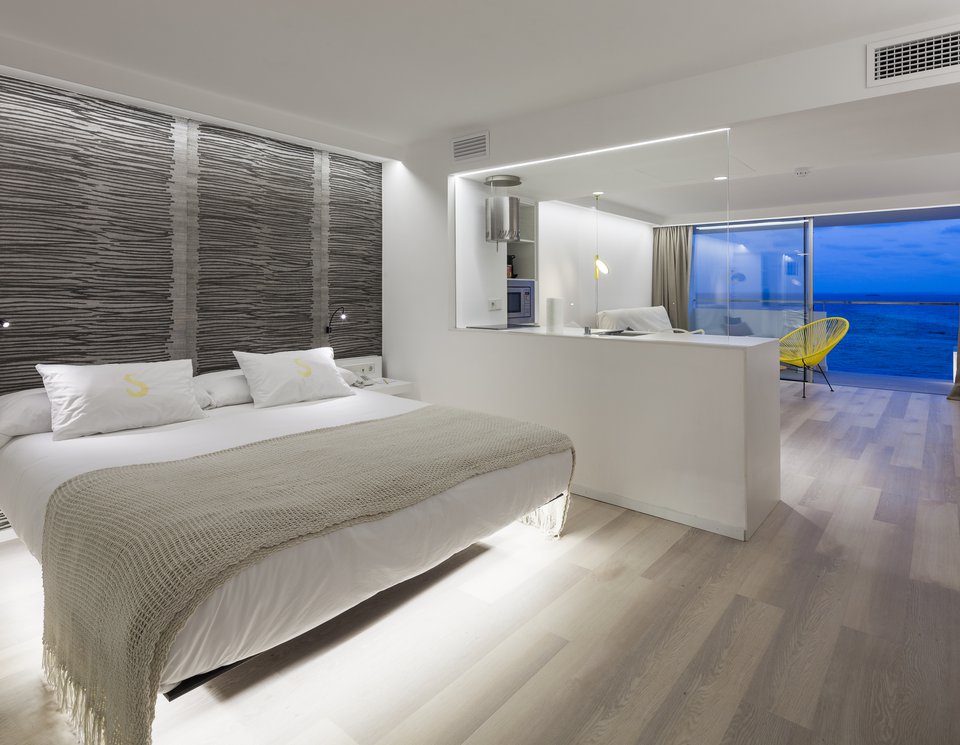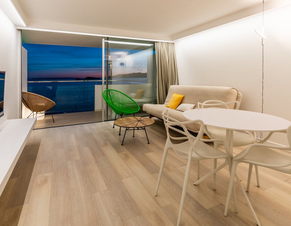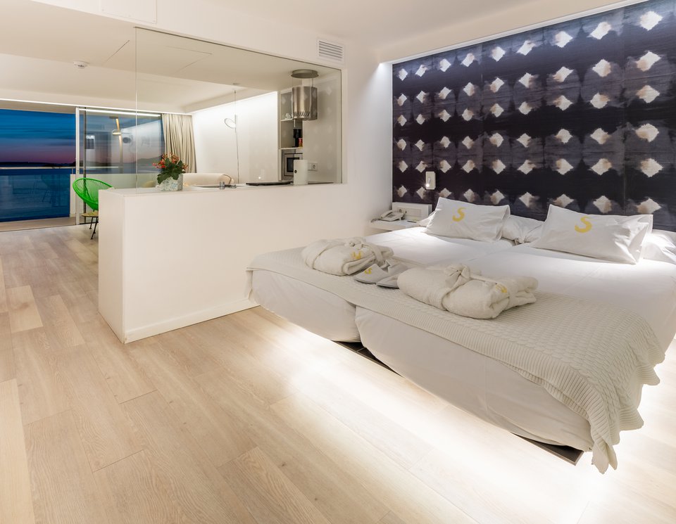 Sud Ibiza Suites is located on the popular Figueretas Beach, just a 15-minute walk (1.3 kilometers) from Dalt Vila, the historic center of the city. Ibiza’s port is 1.4 kilometers from the complex, and the island’s airport is only a 10-minute drive away (approximately 6 kilometers). Several of the world’s most famous nightclubs, such as Hï, Pacha, and UNVRS, are also just a few minutes’ drive from Sud Ibiza Suites. In addition, the renowned restaurant Ciento80 is located on the ground floor of the property itself.