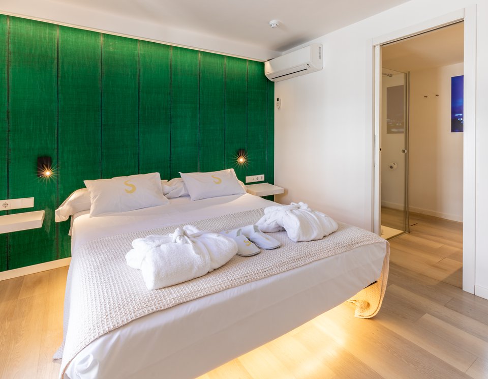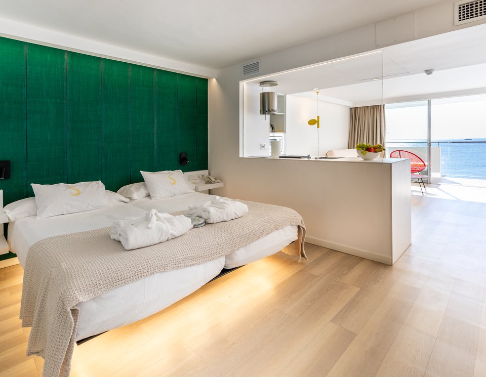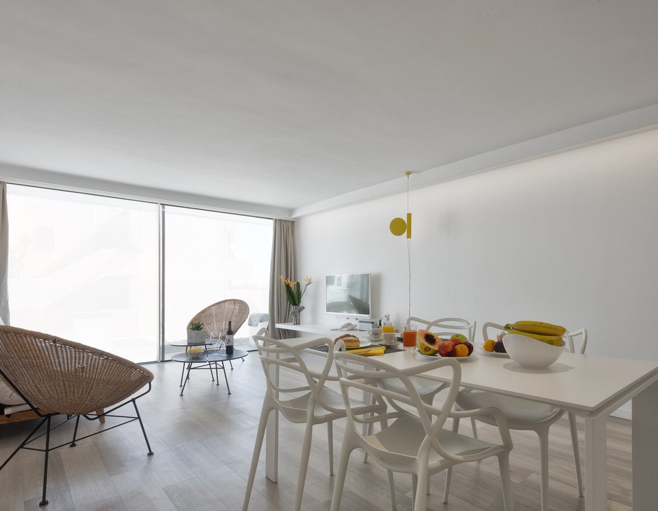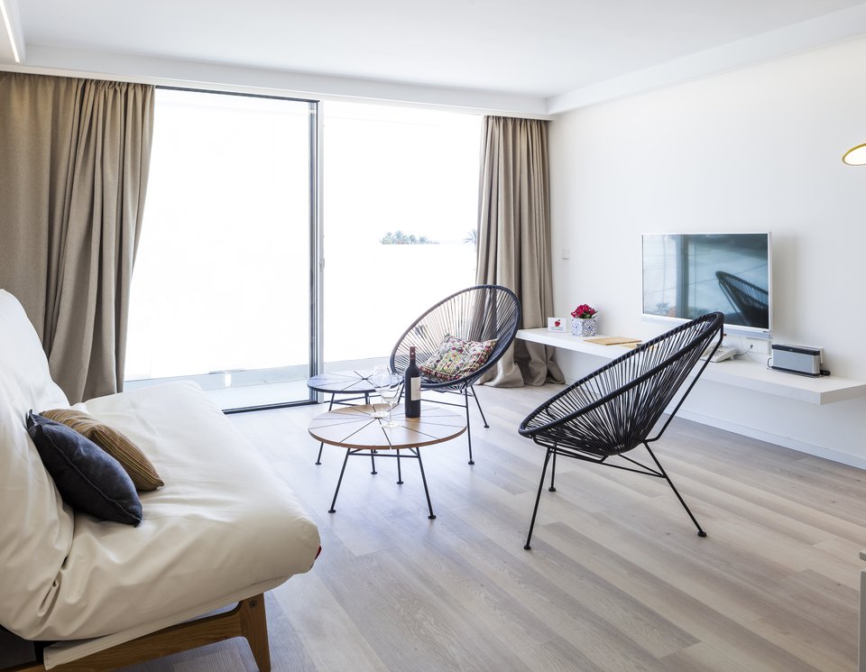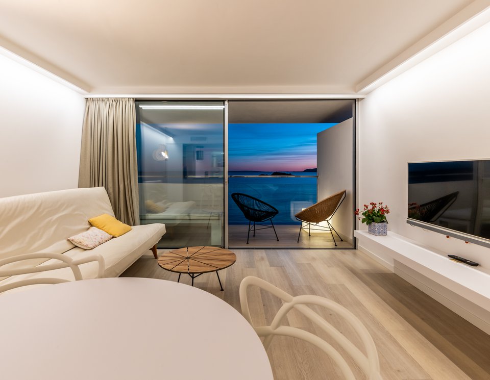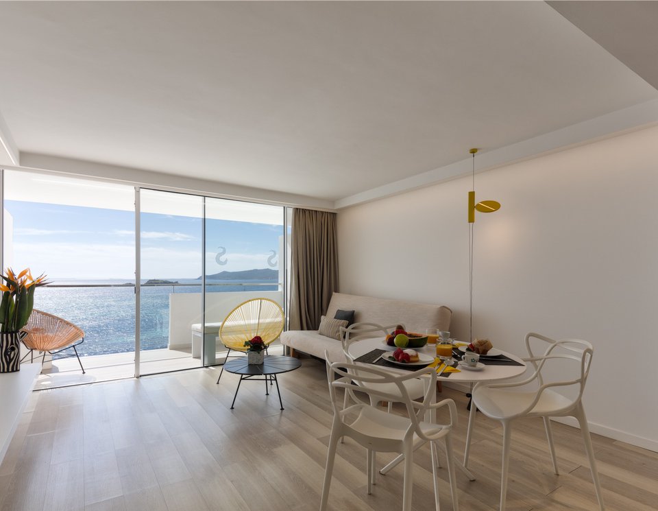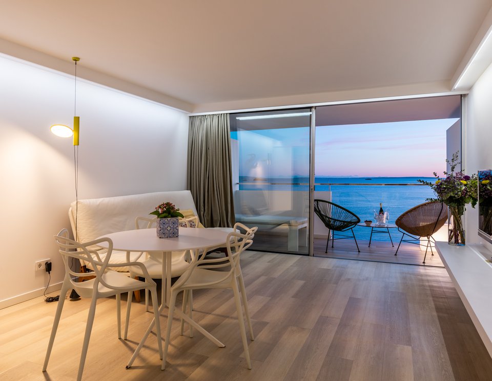 Sud Ibiza Suites is located on the popular Figueretas Beach, just a 15-minute walk (1.3 kilometers) from Dalt Vila, the historic center of the city. Ibiza’s port is 1.4 kilometers from the complex, and the island’s airport is only a 10-minute drive away (approximately 6 kilometers). Several of the world’s most famous nightclubs, such as Hï, Pacha, and UNVRS, are also just a few minutes’ drive from Sud Ibiza Suites. In addition, the renowned restaurant Ciento80 is located on the ground floor of the property itself.