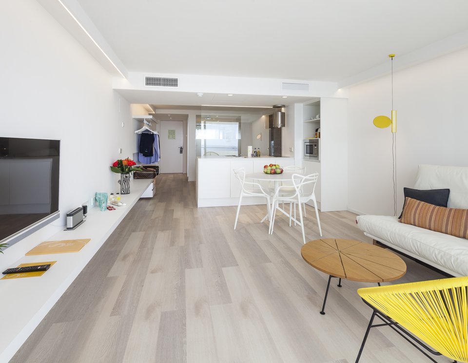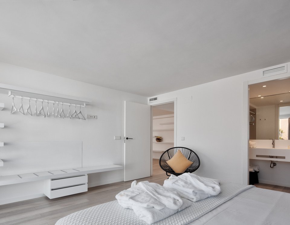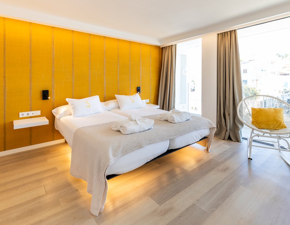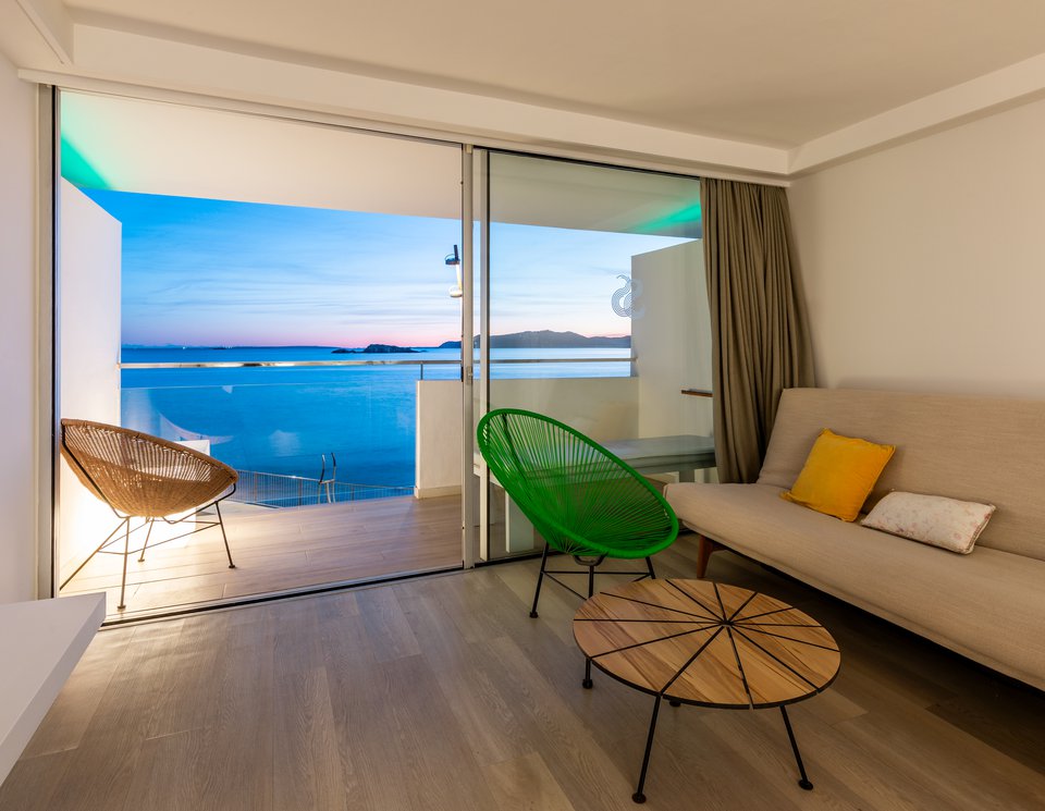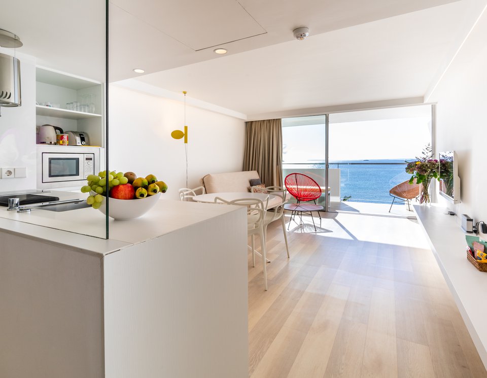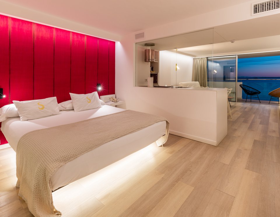 Sud Ibiza Suites is located on the popular Figueretas Beach, just a 15-minute walk (1.3 kilometers) from Dalt Vila, the historic center of the city. Ibiza’s port is 1.4 kilometers from the complex, and the island’s airport is only a 10-minute drive away (approximately 6 kilometers). Several of the world’s most famous nightclubs, such as Hï, Pacha, and UNVRS, are also just a few minutes’ drive from Sud Ibiza Suites. In addition, the renowned restaurant Ciento80 is located on the ground floor of the property itself.